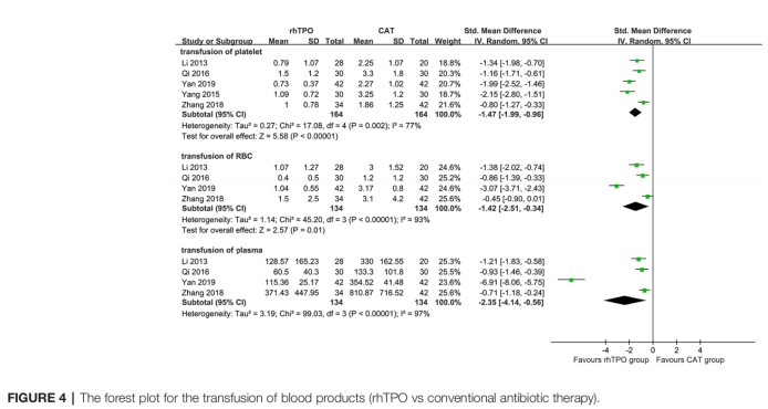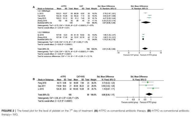 Zhang J, Lu Z, Xiao W, et al. Efficacy and safety of recombinanthuman thrombopoietin on sepsis patients with thrombocytopenia: asystematic review and meta-analysis [J]. Front Pharmacol, 2020, 11:940.