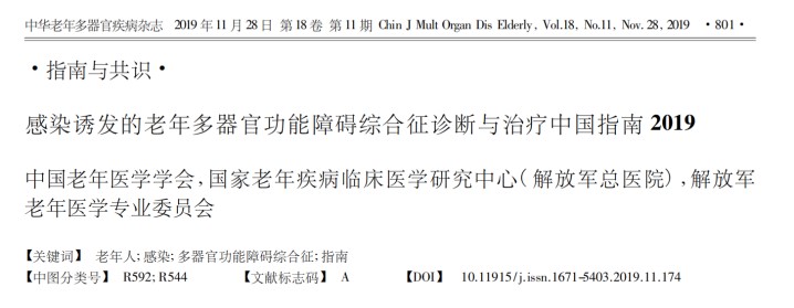 中国老年医学学会 , 国家老年疾病临床医学研究中心 ( 解放军总医院 ), 解放军老年医学专业委员会 . 感染诱发的老年多器官功能障碍综合征诊断与治疗中国指南 2019 [J]. 中华老年多器官疾病杂志 , 2019, 18(11): 801-838